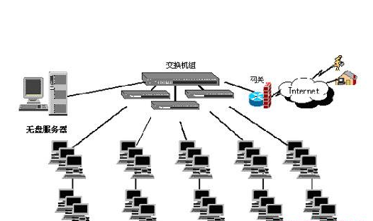 網(wǎng)吧內(nèi)采用的無盤網(wǎng)絡(luò)系統(tǒng)。網(wǎng)吧機器分為服務(wù)器和客戶機兩個部分,在無盤系統(tǒng)下,客戶機是不用配置硬盤的,所有客戶機通過網(wǎng)絡(luò)連接服務(wù)器內(nèi)的超大容量硬盤,并利用硬盤內(nèi)的系統(tǒng)鏡像啟動,而服務(wù)器硬盤內(nèi)的文件在所有的客戶機上都能讀取。